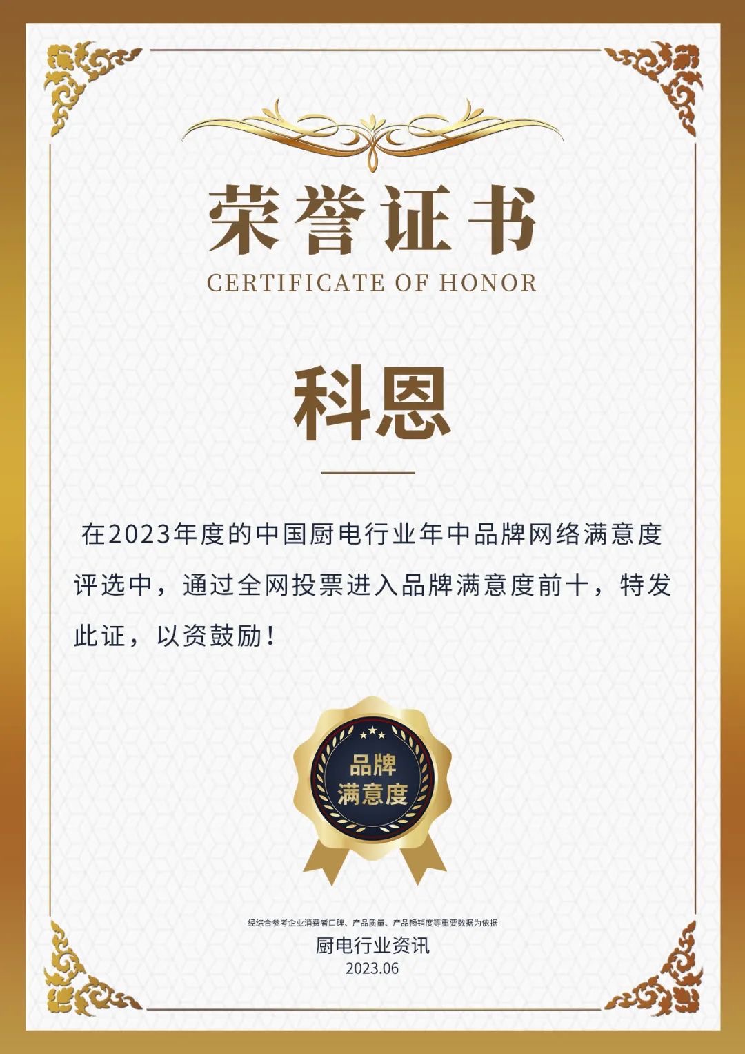 本次榮獲“2023年度中國(guó)廚電行業(yè)品牌年中網(wǎng)絡(luò)滿(mǎn)意度前十”、“2023年度中國(guó)集成灶行業(yè)品牌年中網(wǎng)絡(luò)滿(mǎn)意度前十”,再次印證了行業(yè)及消費(fèi)者對(duì)科恩的認(rèn)可,未來(lái)科恩將繼續(xù)秉持初心以產(chǎn)品為原點(diǎn),深耕行業(yè)。以為中國(guó)家庭打造智慧廚房生活,及推動(dòng)中國(guó)廚電行業(yè)發(fā)展繼續(xù)前行!