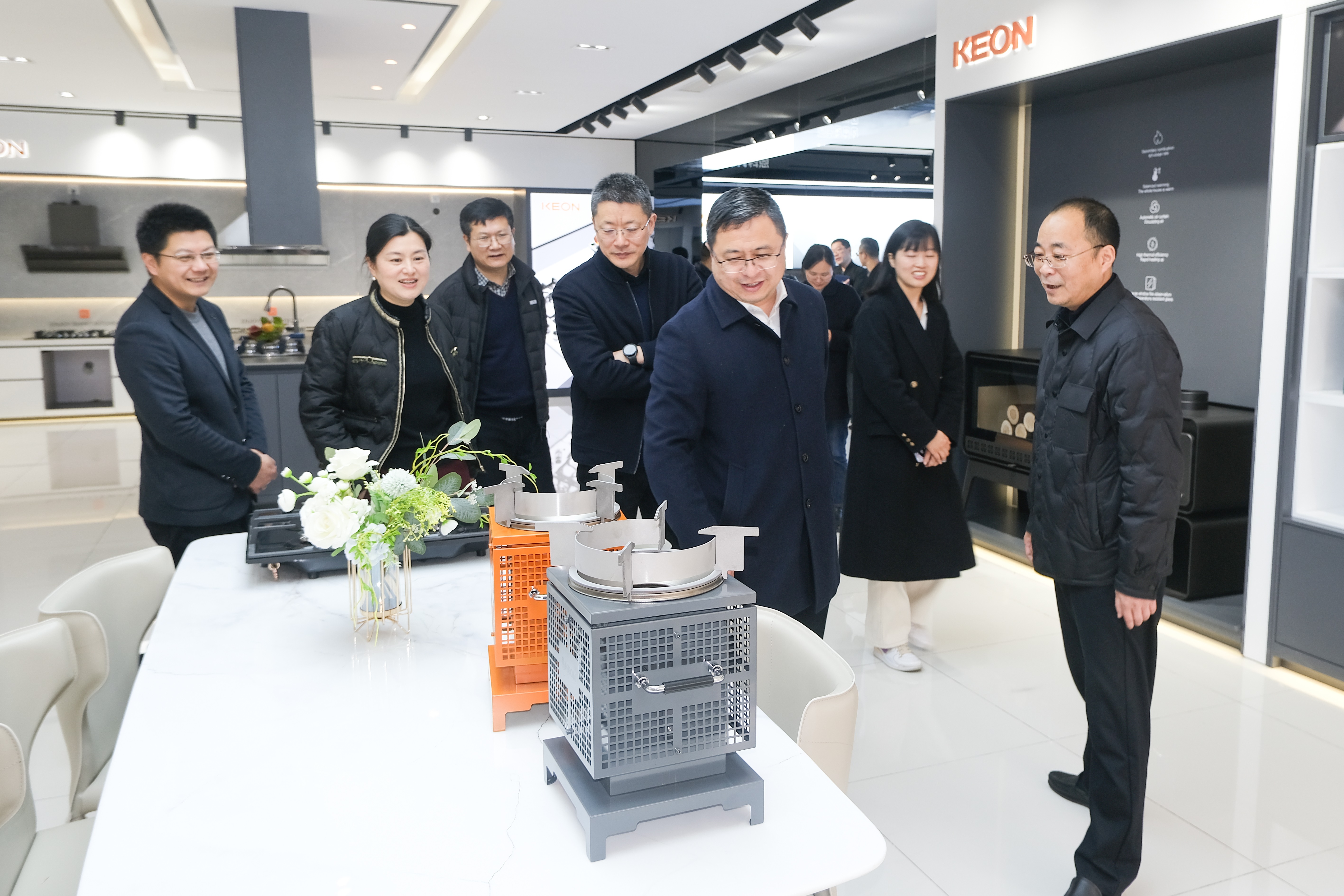 在科恩董事長俞鋒的熱情接待和陪同下,調研組一行參觀了科恩電器的企業文化長廊,科技展廳,全面系統地了解科恩電器的發展歷程,產品創新研發情況,重點調研了無煙氣化爐等智能廚電產品的研發與應用。
