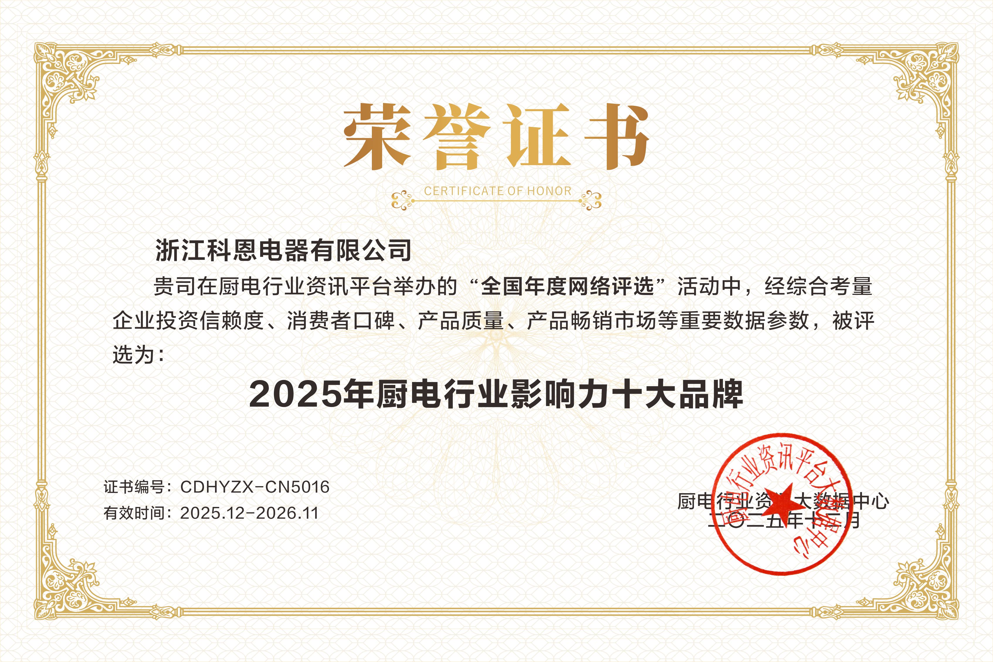 近日,廚電行業(yè)重磅榜單揭曉,科恩電器以卓越實(shí)力與口碑,一舉榮獲“2025年廚電行業(yè)影響力十大品牌”與“2025年廚電行業(yè)消費(fèi)者好口碑十大品牌”雙項(xiàng)大獎(jiǎng)。這份榮譽(yù)不僅是對科恩電器多年來深耕廚電領(lǐng)域的肯定,更見證了品牌在用戶心中扎根生長的溫暖力量。